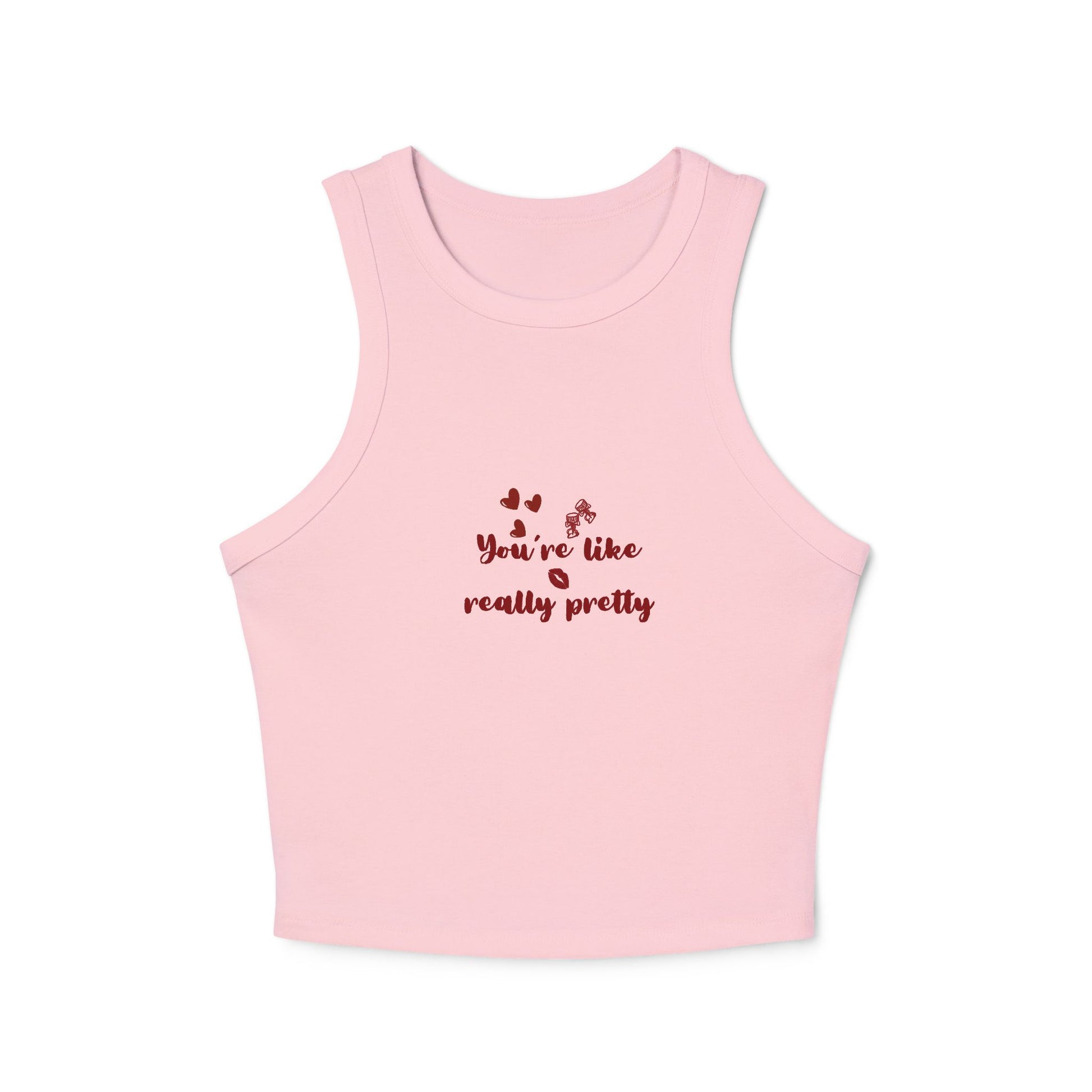 A modern and chic tank top with a 'you're like really pretty' design, offering a snug and tailored fit for both comfort and style. Perfect for layering or wearing on its own during various activities. Relevant to women looking for a stylish and comfortable top for casual wear or workouts. Suitable for occasions like birthdays, vacations, or girls' night out.